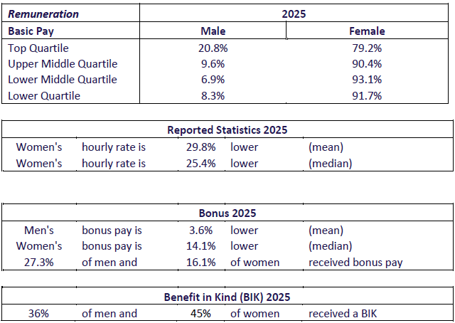 Female representation remains strongest in the lower pay quartile, reflecting gender concentrations in certain cohorts of staff and broader industry gender trends and demographics. However, there was a notable decrease in this quartile to 91.7%, due to the effects and changes of the company implementing career progression pathways.